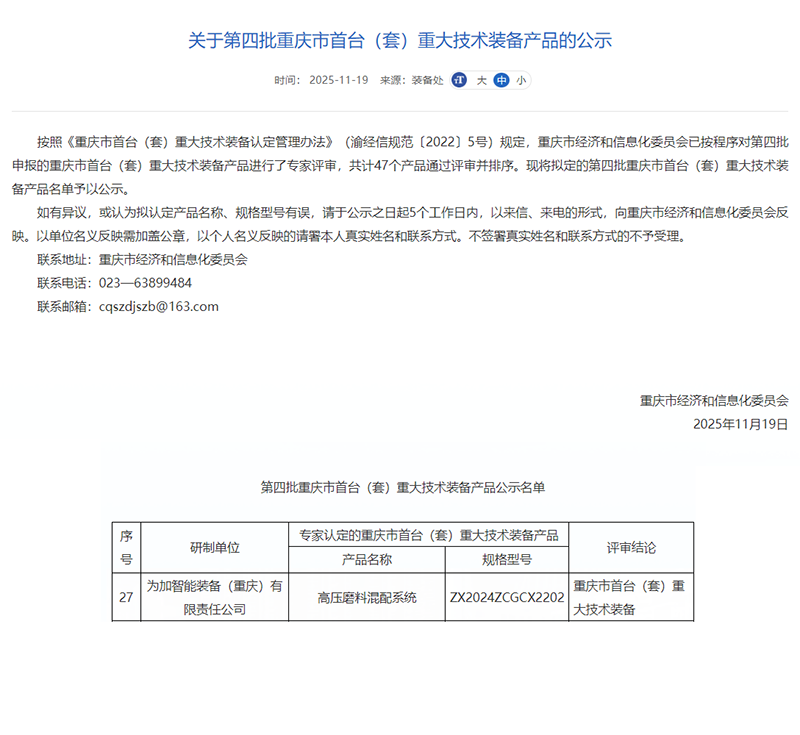 近日,为加智能自主研发的“高压磨料混配系统”,成功入选第四批重庆市首台(套)重大技术装备产品名单。该装备已顺利交付中海油乌干达项目,获权威认可。