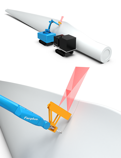 3、3D视觉辅助 机器臂前端搭载 3D 视觉相机,运行送为加 自主开发的视觉算法,可以无需3D 数模、无需编程,通过自动化的方式,完成对叶片的各类型切割。
